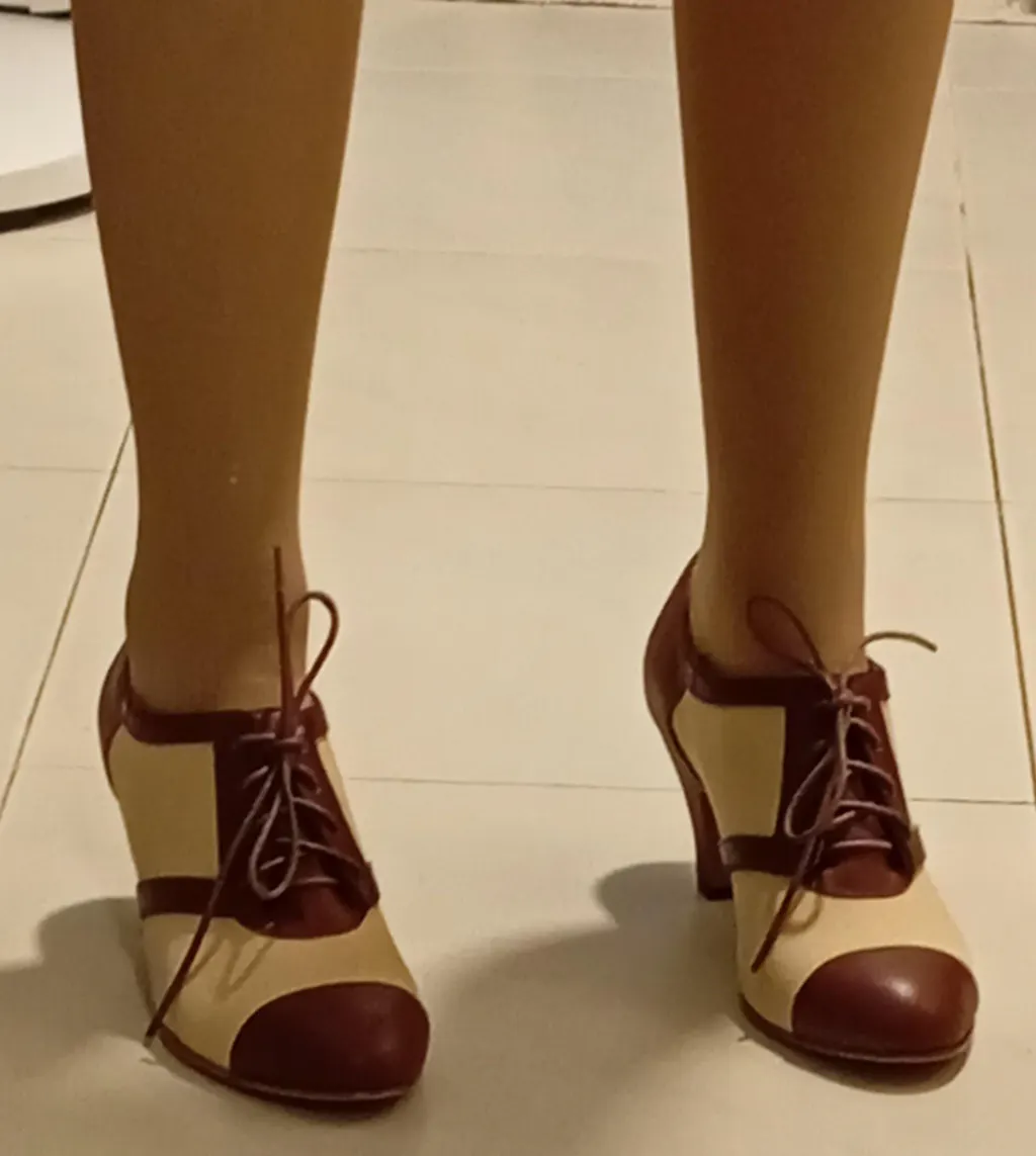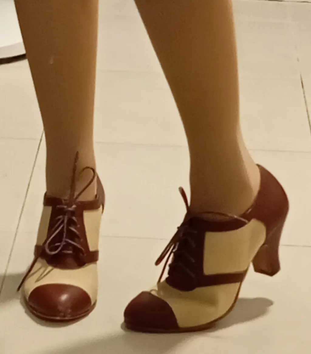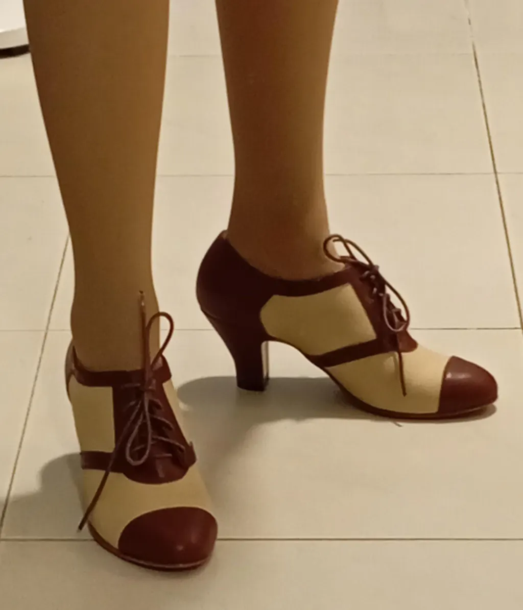 How better to complete a 1920s or 1930s sporty ensemble than with a perfect pair of Evelyn oxfords? These retro spectator oxfords are made of tan canvas combined with black leather on a 2 3/8" / 6 cm Spanish heel and insole arch support.