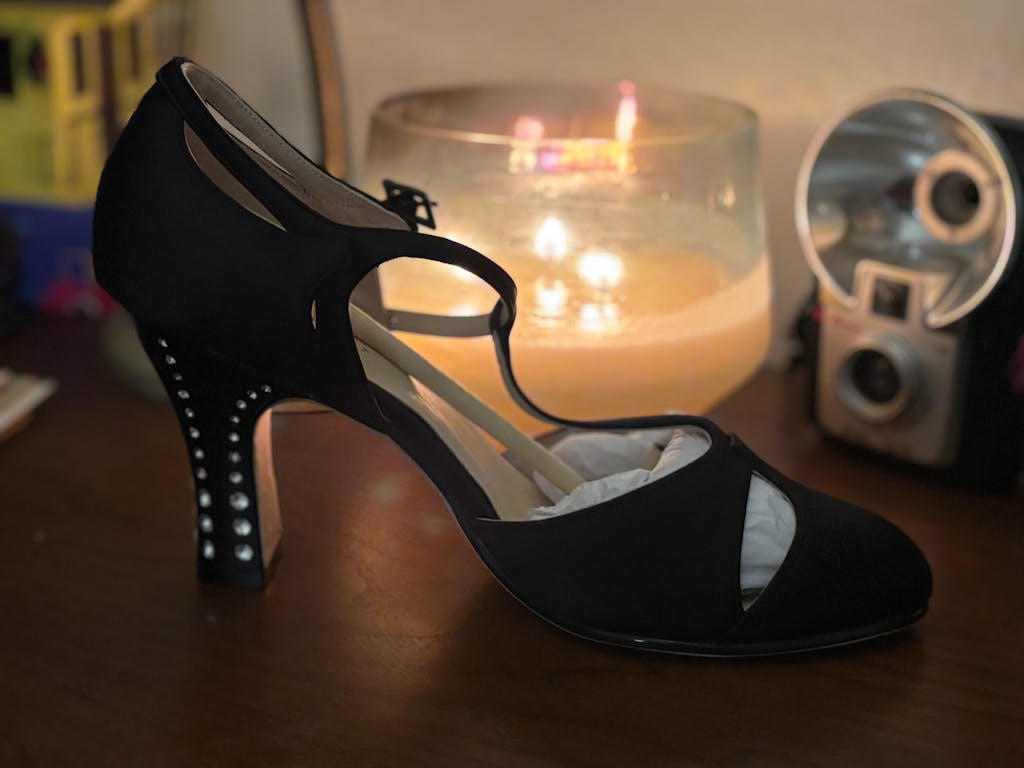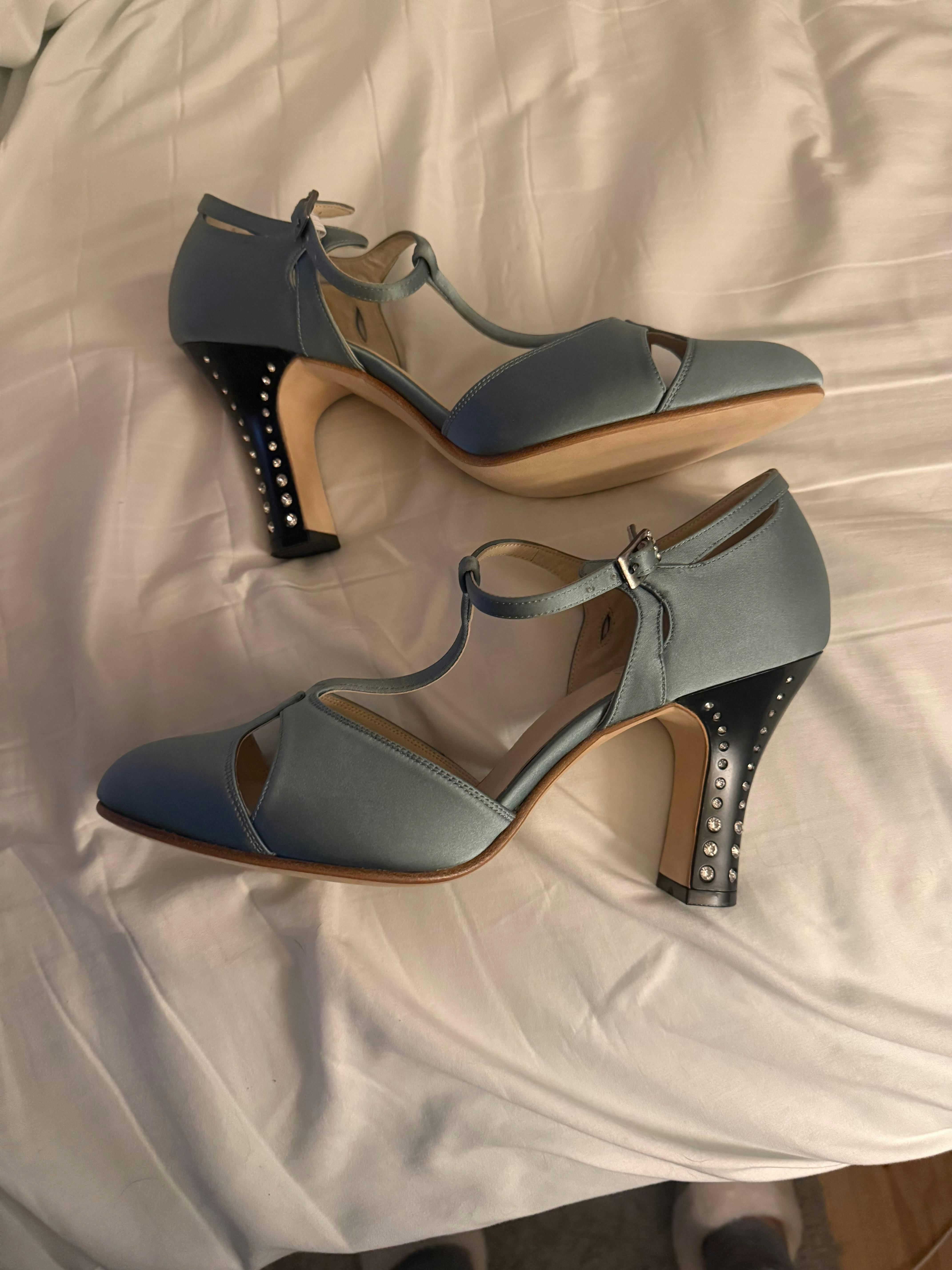 Be the life of the party in these extraordinary 1920s pumps. Marigold features a gorgeous, 3.5"/9 cm lacquered Spanish heel, sparkling with hand-inset graduated glass rhinestones. This shoe is resplendent with real silk uppers, in luxurious and elevated colors. Unsealed leather soles go smoothly from the ballroom to the street. Based on the lavishly decorated pumps from the Roaring 20s, Marigold is a sumptuous, one-of-a-kind shoe that is fit for dancing the night away.
